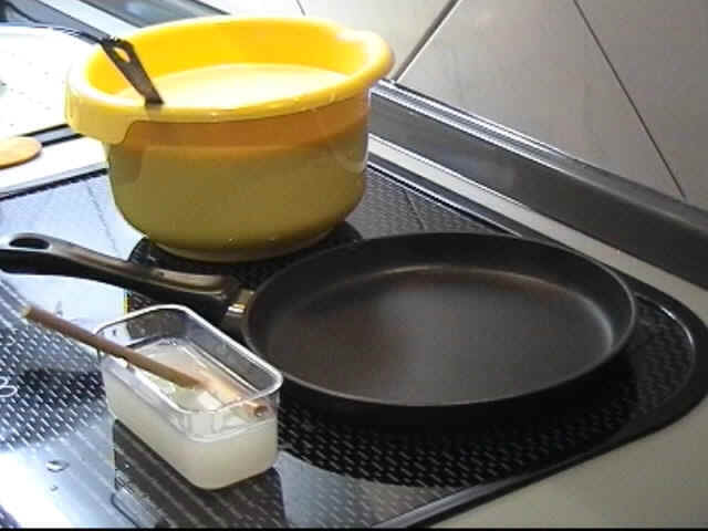 (Bodendurchmesser ab 20 cm) und stellen Sie Ihr Zubehör wie auf dem Bild auf den Herd. Erhitzen Sie die Pfanne und reiben Sie sie mit einem öligen Tuch aus. (bitte nur ganz wenig Öl verwenden und nur am Anfang !)