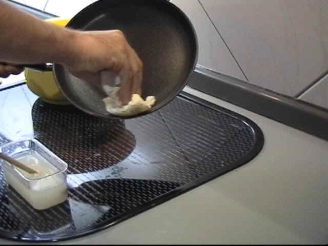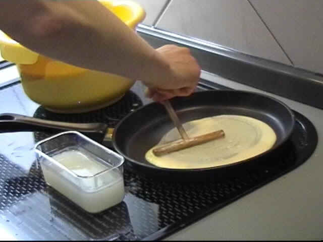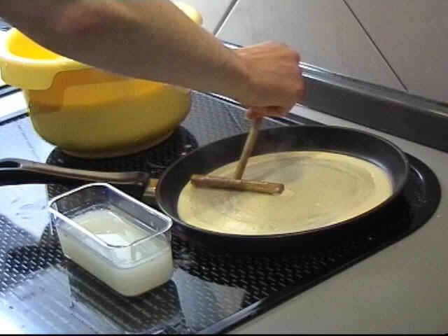 Nach jedem Crêpes sollten Sie die Reste von Teig und Belag aus der Pfanne mit einem Stück Küchenrolle auswischen, so bleibt sie immer sauber und erlaubt ein besseres Arbeiten. |